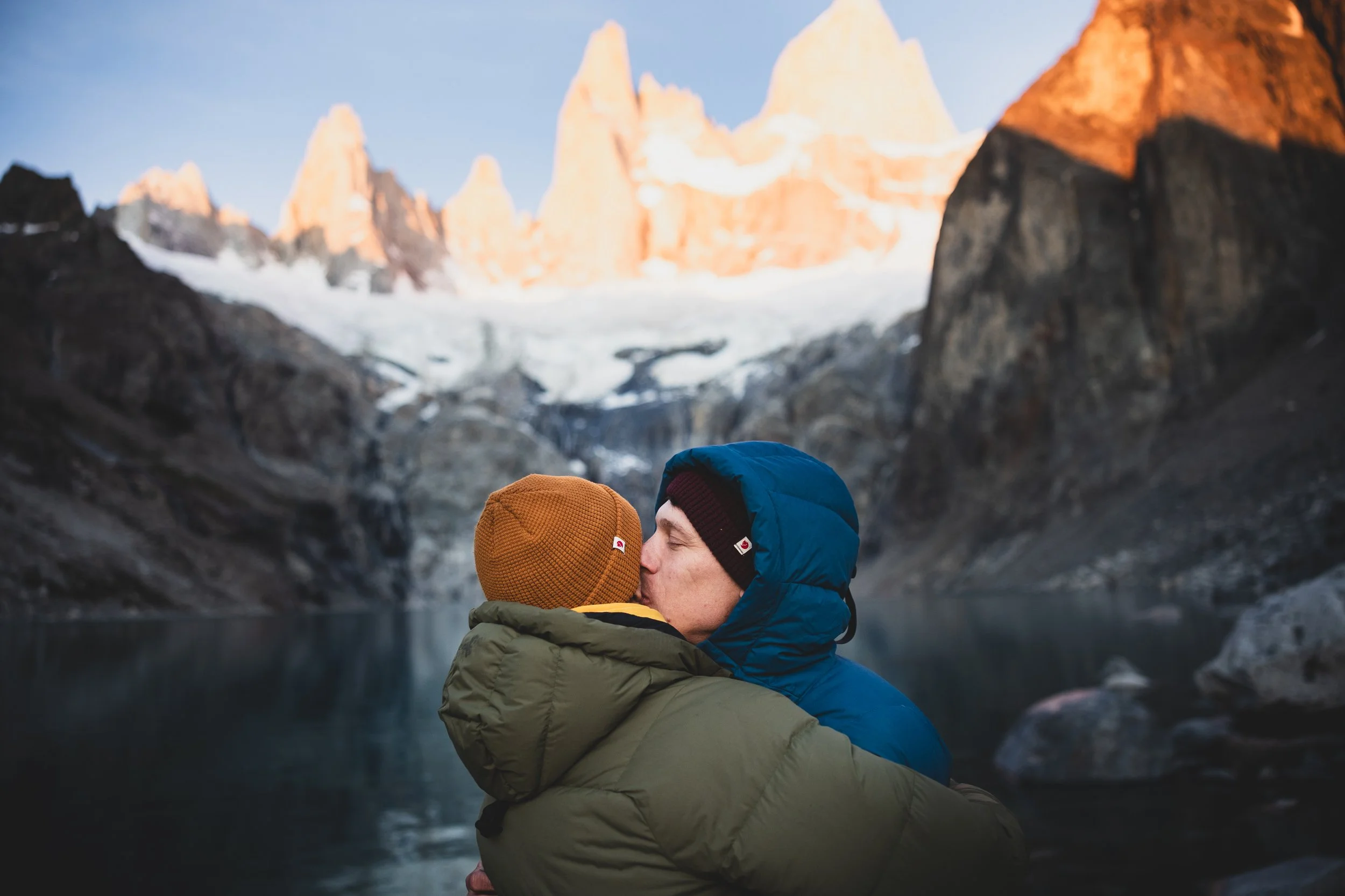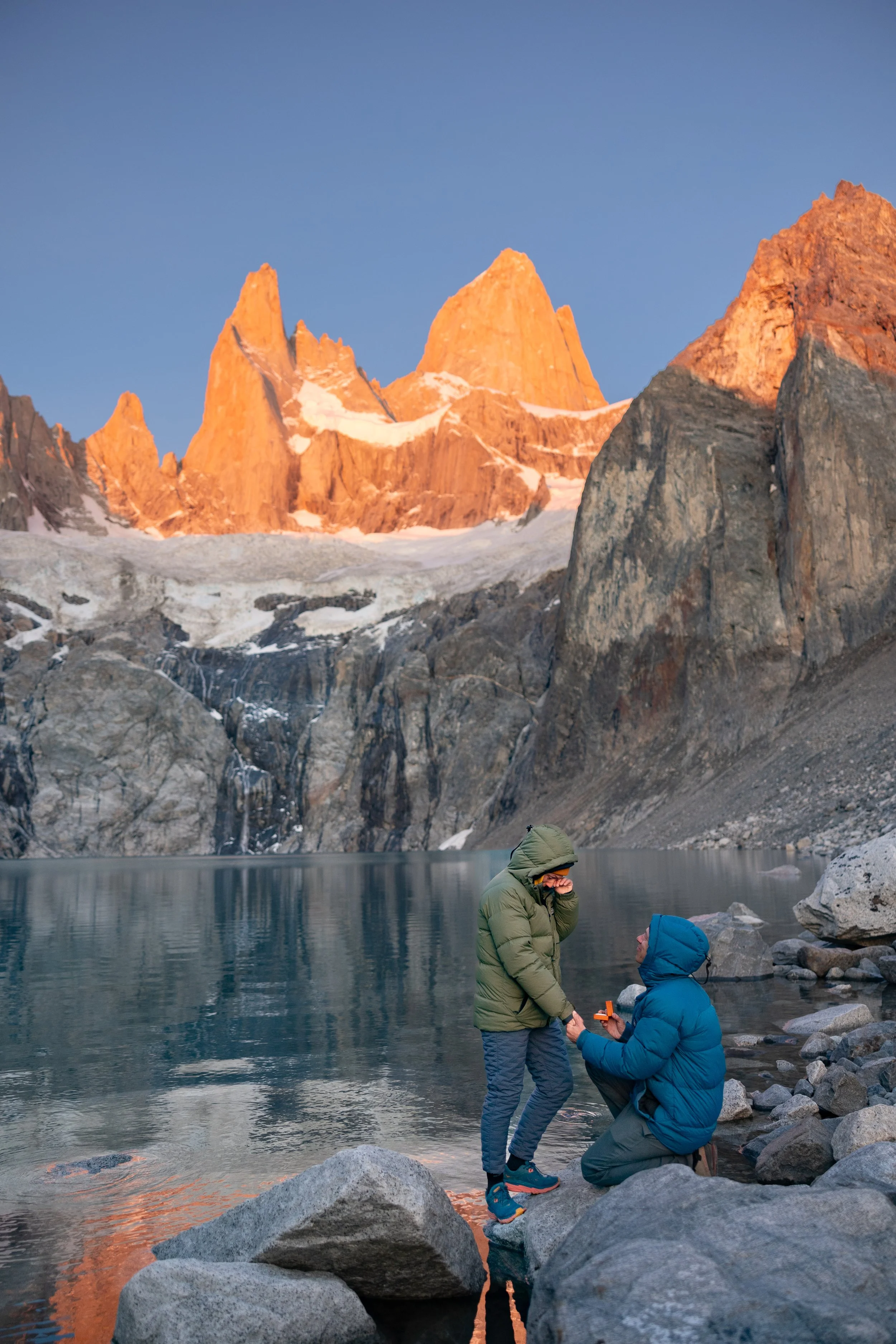 And then, one morning in the middle of a 18 mile hike, at the side of a glacial lake, with the sun rising on a Patagonian mountain range… boy surprised girl with a proposal.
